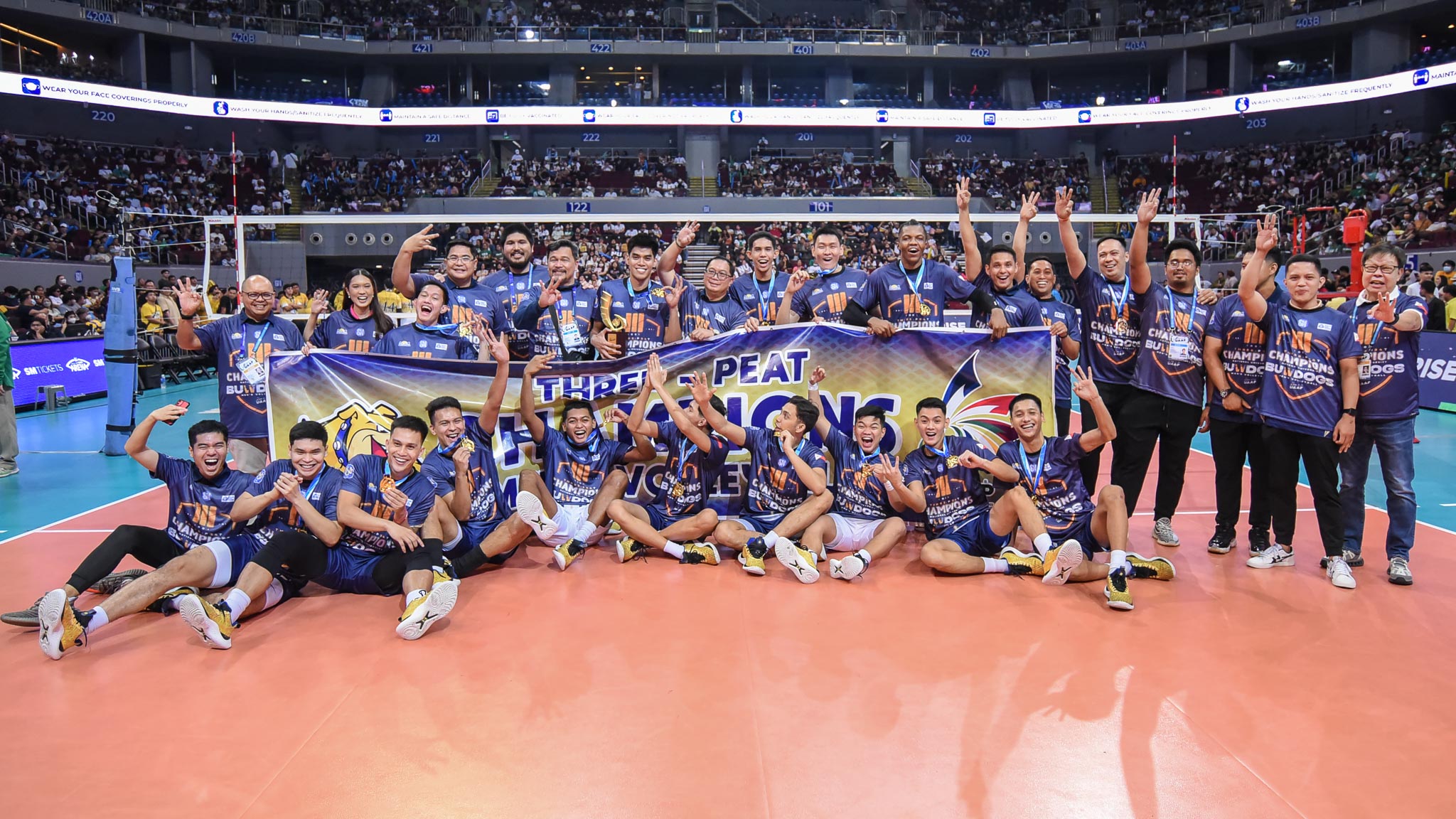 The National University (NU) Bulldogs clinched their third consecutive UAAP volleyball championship by defeating the University of Santo Tomas (UST), 25-20, 25-21, 25-20, to complete a 16-game sweep of the UAAP Season 85 men’s volleyball tournament on Sunday at the SM Mall of Asia Arena.
