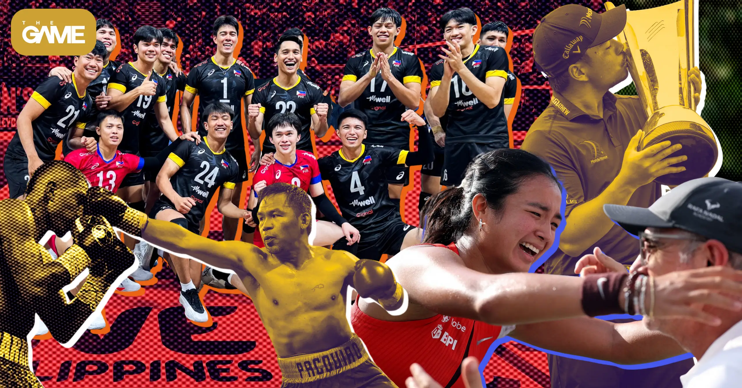 Banner images from AFP, Philippine National Volleyball Federation, Manny Pacquiao, and Asian Tour on Facebook.